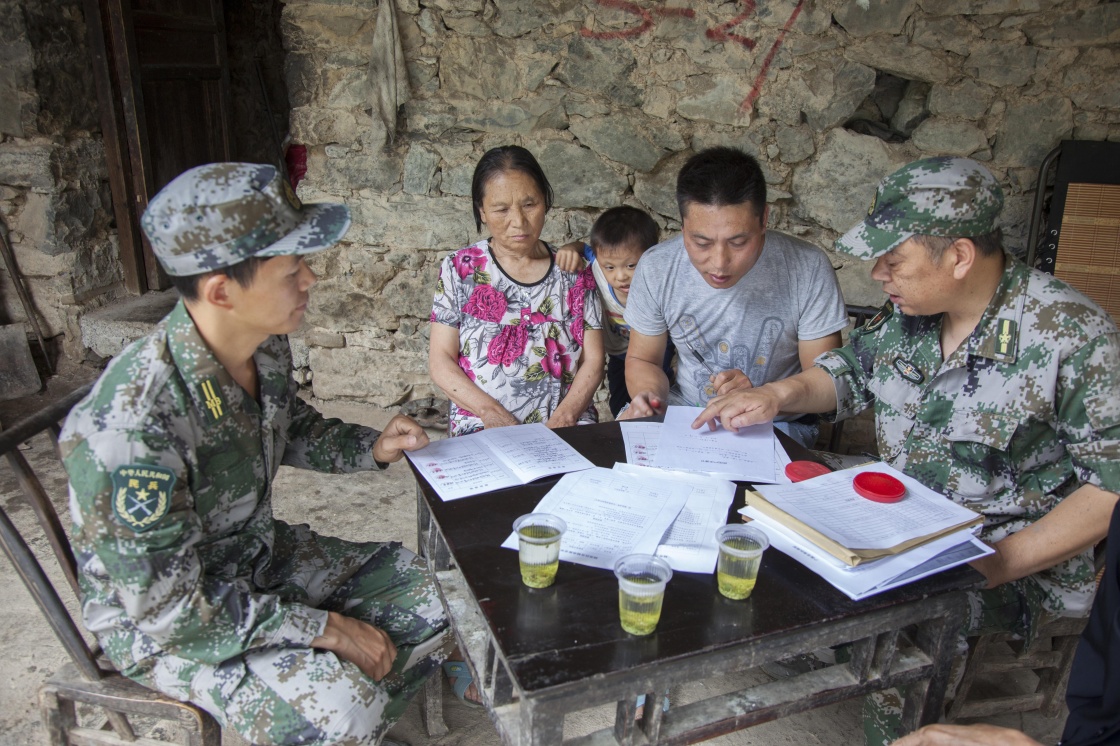 湖北省恩施軍分區“131”扶貧小分隊到對口幫扶的紅土鄉天落水村村民家中入戶核實相關情況(2018年7月4日攝)。新華社發(王海 攝)