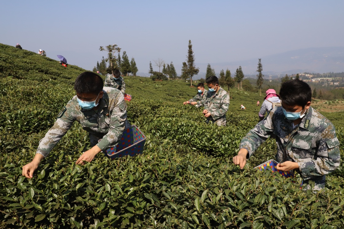 貴州省六盤水市水城區人武部組織基干民兵和群眾一起采摘新茶(2020年2月25日攝)。新華社發(趙嬋娟 攝)