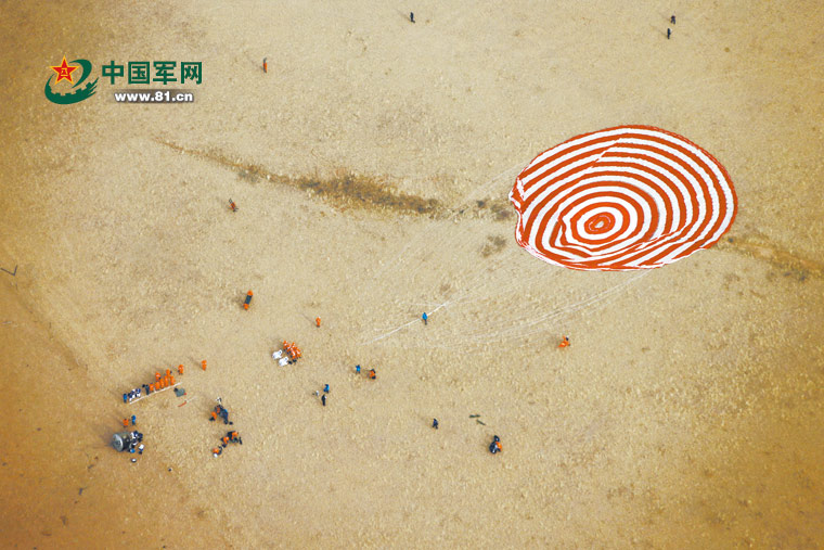 13時59分,神舟十一號飛船返回艙成功著陸,航天員景海鵬、陳冬從太空回到地球家園。