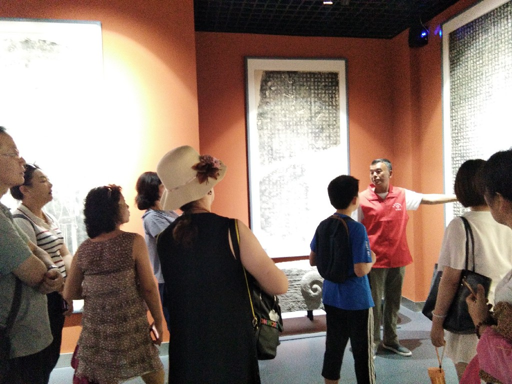 加入志愿者大家庭后,王老師發(fā)現(xiàn):年輕的高校生都是“小鮮肉”、“顏值高”,還有從事歷史、文物工作的社會人士,年齡比他大10歲的最年長志愿者也是高校教師。大家經常在微信群里交流專業(yè)知識和講解技巧。王立彬認為自己年齡、專業(yè)都不占優(yōu)勢,更加謙虛好學,一方面經常去省圖書館閱讀文物著作,背誦詩詞和文物上拗口難認的銘文;另一方面,不拘泥于解說詞,他根據(jù)自己對濟南周邊文化景點和文物出土地點的熟悉,在解說中添加了很多歷史典故,古今貫通,幽默詼諧。沒想到,他的小故事、小笑話,小包袱,幫助他很快形成了自己的風格。