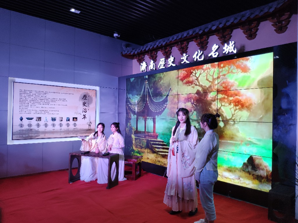 夜間的博物館依舊明亮奪目,講解員引領著市民朋友踏進展廳,欣賞著與白日不同的景色,就連鎮館之寶“西漢彩繪樂舞雜技陶俑”也仿佛揭開了神秘的面紗。陶盤上樂工、演技人和觀賞者齊現,展示著漢代“百戲”的盛大場面,而樓下的展廳,早已有琴待撫,有袖待舞。古裝舞臺劇《如夢令·常記溪亭日暮》、《辛棄疾活捉叛徒》將“濟南二安”演繹的活靈活現,既有待字閨中的詩詞,又有鐵馬金戈的熱血,現場叫好聲不斷,仿佛一場西漢的“百戲”穿越至今,在博物館里等待著觀者的到來,共同演繹新時代下的樂舞盛景。