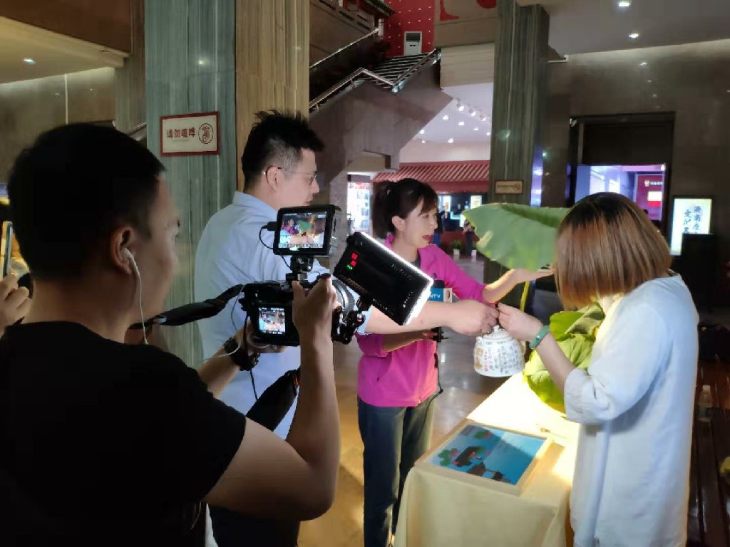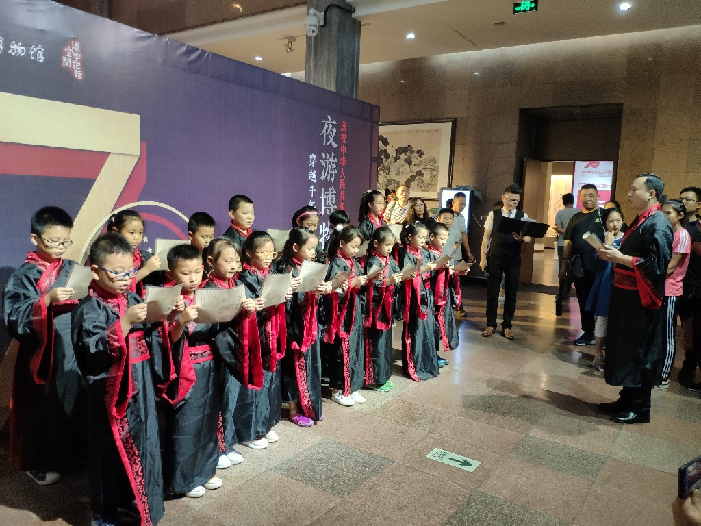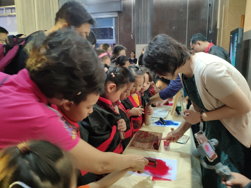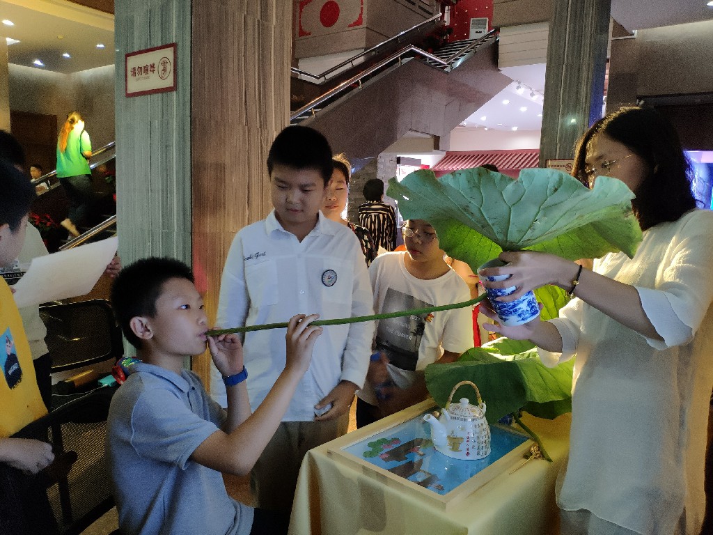 活動現場的文化體驗項目也是熱鬧非凡,孩子們被新奇的碧筒飲深深的吸引著。在工作人員的指導下,一名學生好奇的舉起荷葉湊到唇邊,當清冽的茶湯通過長長的莖管沁入口中時,不由得露出甜甜的笑意,瞬間引燃了圍觀的孩子們。展廳的另一邊,小朋友們熱火朝天的拓印著“不忘初心、牢記使命”漢字樹雕版、廉潔之樹雕版、長征主題雕版以及新中國成立70周年主題雕版等多種內容,體驗、牢記、收藏紅色記憶,用非遺文化傳承紅色基因。活動最后,小小漢字守護人身著漢服,以集體誦讀《漢字禮贊》的形式,表達對祖國傳統文化的熱愛,用朗朗漢字之音為新中國成立70周年獻禮。