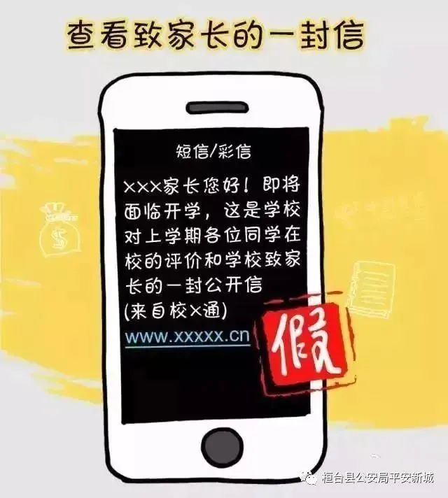 詐騙方法:詐騙分子利用家長或學生的信息,發布各種帶有病毒的鏈接,幫助其竊取銀行卡信息騙錢。