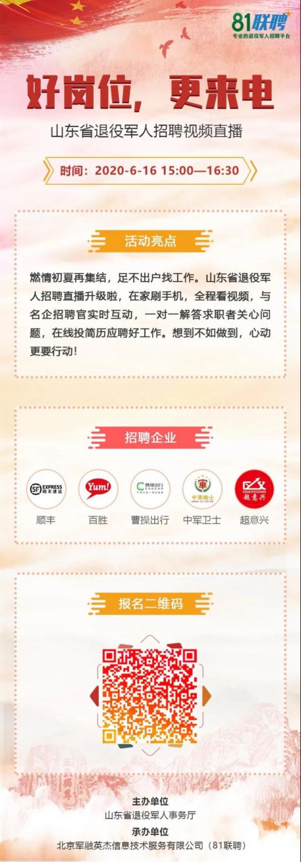 記者從省退役軍人廳獲悉,6月15日下午3點(diǎn),省退役軍人招聘直播再升級(jí),屆時(shí),順豐速運(yùn)有限公司、百勝中國(guó)山東分公司、曹操出行青島運(yùn)營(yíng)中心、山東中軍衛(wèi)士集團(tuán)有限公司和濟(jì)南超意興餐飲有限公司五家企業(yè)將在線上集結(jié),發(fā)布優(yōu)質(zhì)崗位,介紹福利待遇,解答網(wǎng)友提問(wèn)。(大眾日?qǐng)?bào)客戶端記者齊靜報(bào)道)