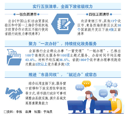 一張負(fù)面清單所含事項(xiàng)僅占省級(jí)行政權(quán)力事項(xiàng)的7.5%,四張正面清單囊括省級(jí)行政權(quán)力720項(xiàng)。山東簡政放權(quán)力度準(zhǔn)度并重,正負(fù)清單激發(fā)制度創(chuàng)新澎湃活力。