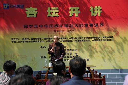 2015年4月18日,由曲阜市文物局創新舉辦的“杏壇開講”儒學講座首講儀式在曲阜孔廟杏壇隆重舉行。著名儒學大家、中國人民大學孔子研究院院長張立文教授作了題為《儒學是中華民族發展壯大的重要滋養》首講報告,從儒學的“浴火新生”、“生命不息”、“和合儒學”三個層面對儒學進行了全面而概要性的闡述。